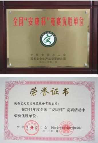 我公司榮獲2011年度全國“安康杯”競賽優勝單位稱號。全國“安康杯”競賽活動是全國總工會、國家安全生產監督管理總局聯合開展的全國工業企業安全生產與職業衛生健康活動。自1999年開展以來,我公司已于2001年、2007年、2011年三次榮獲全國“安康杯”競賽活動優勝單位殊榮。