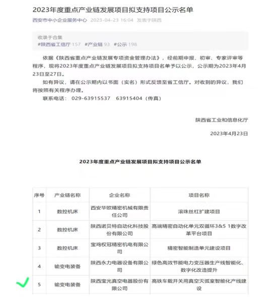 通過認真籌備、資料審核及現(xiàn)場答辯,由公司組織申報的“72.5kV、126kV及以上高電壓等級真空滅弧室產(chǎn)品研發(fā)及產(chǎn)業(yè)化”項目與“高鐵車載開關用真空滅弧室智能化產(chǎn)線建設”項目分別中榜陜西省工信廳2023年關鍵核心技術產(chǎn)業(yè)化“揭榜掛帥”項目與重點產(chǎn)業(yè)鏈發(fā)展項目,并已進入公示階段。